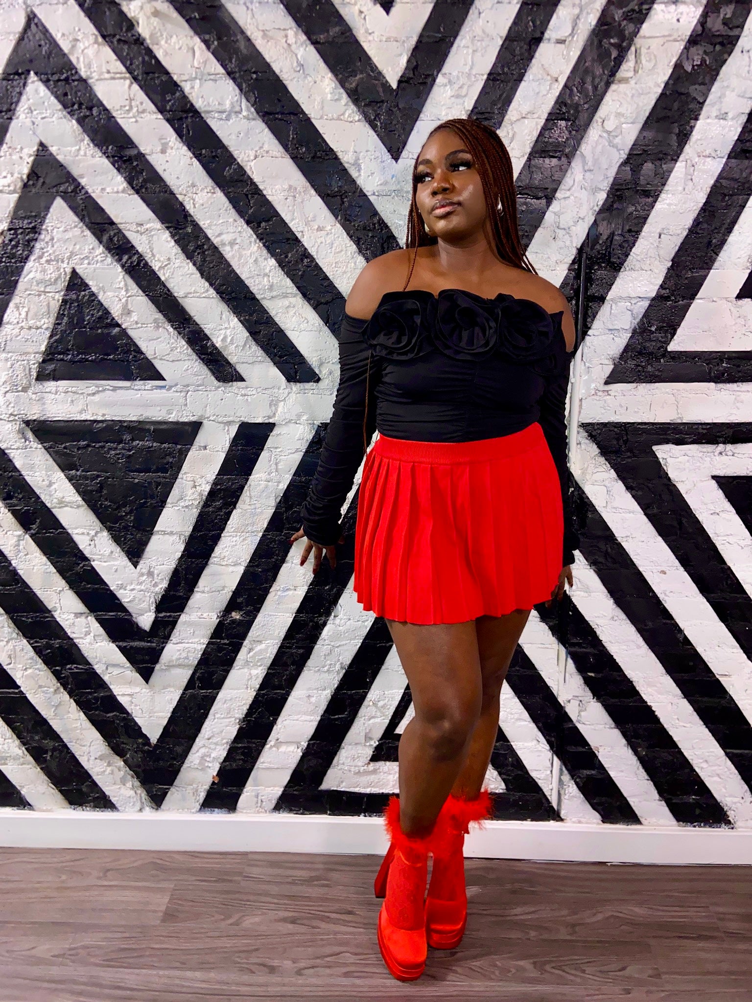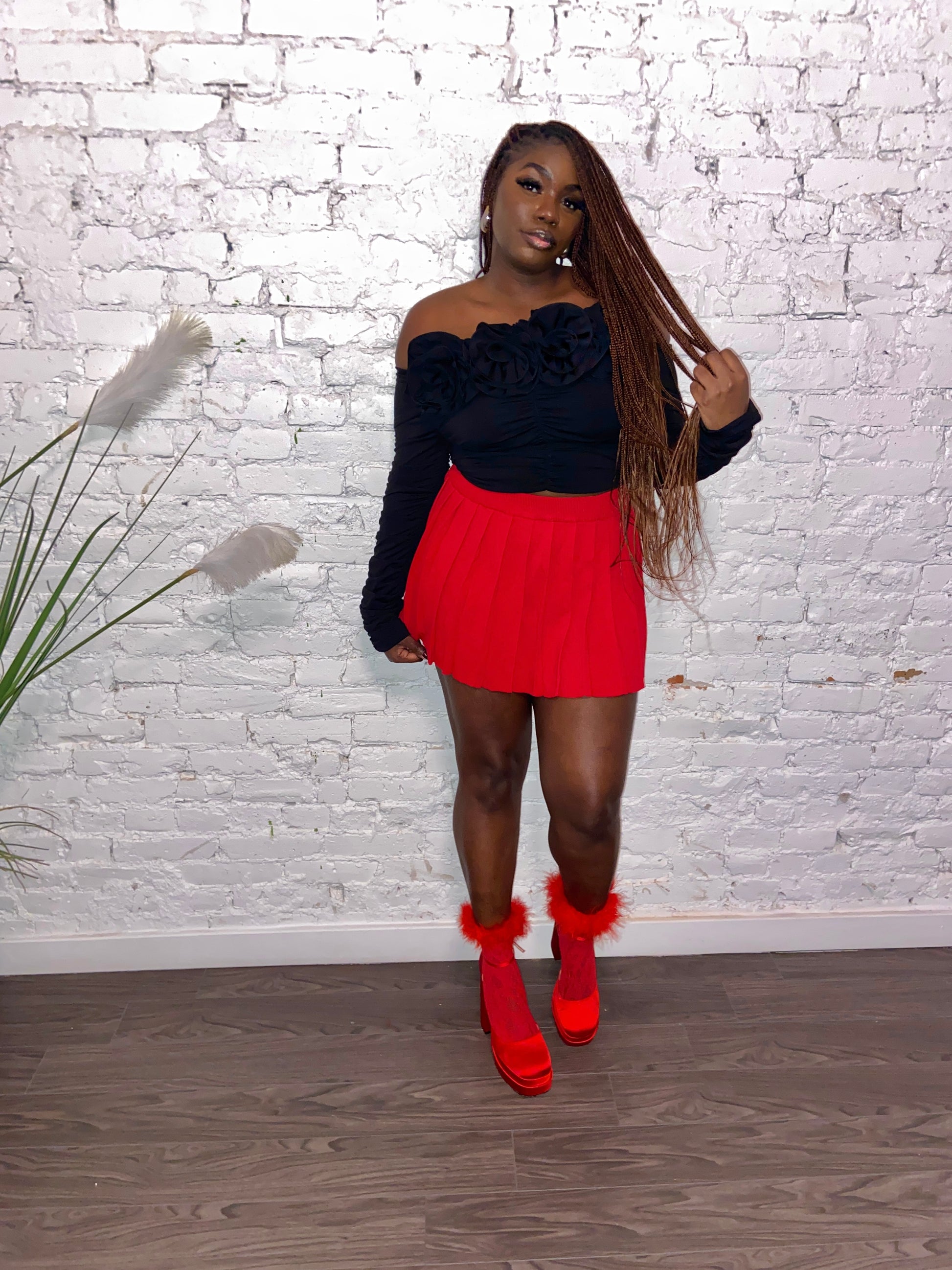 Fall in LOVE with this beautiful statement top. Perfect for Valentines Day and will pair perfectly with our Pleated Vixen Red Skirt. Noir Roses is a stretchy, off the shoulder and ruched top. Featuring detachable roses. Great stretch and fits true to size. Model is wearing a size medium.