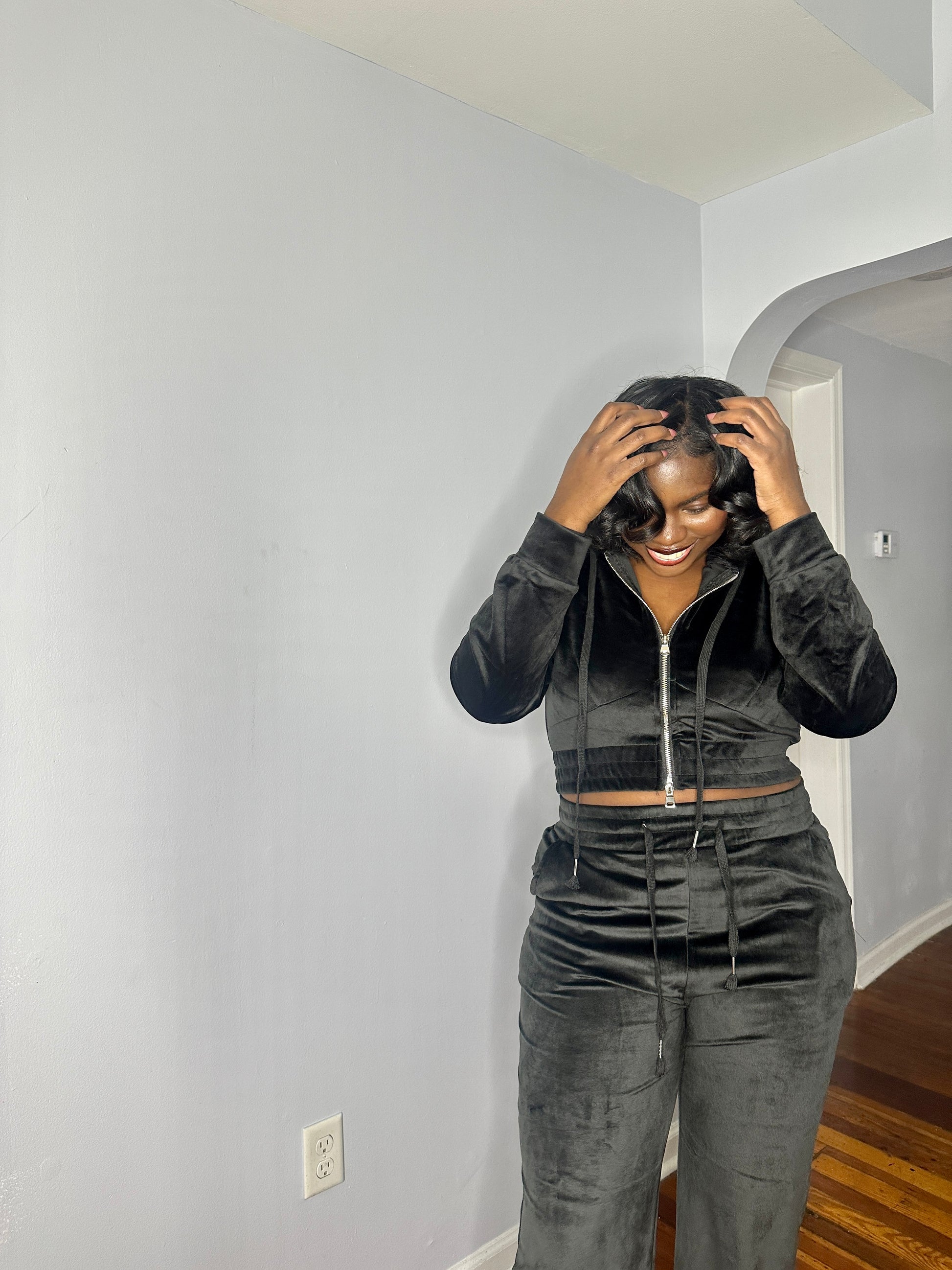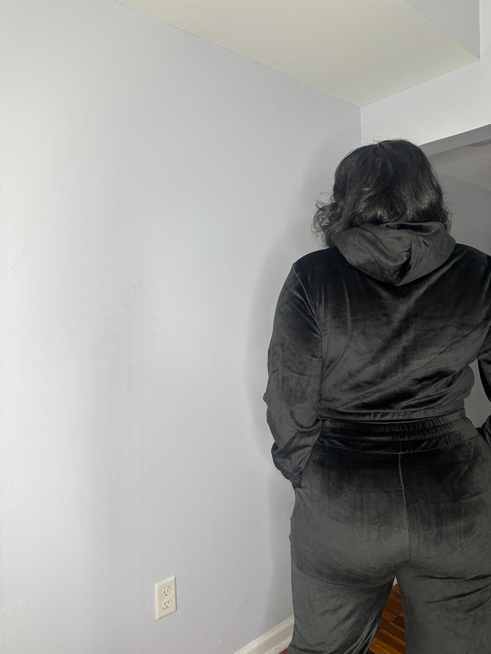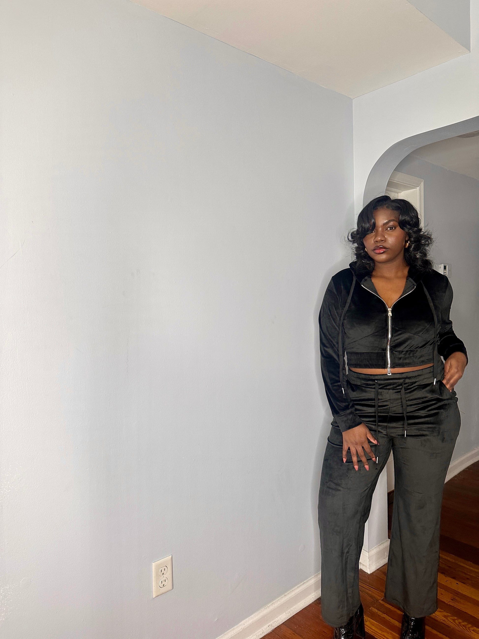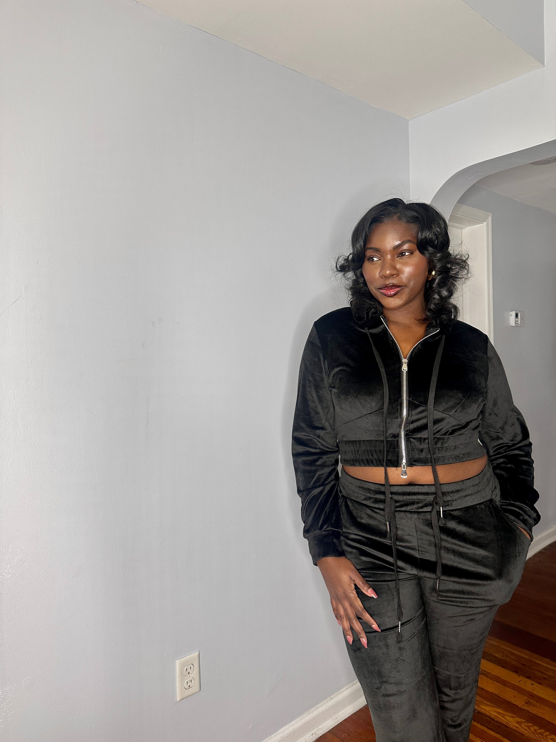 The ultimate cozy velour sweatsuit. Featuring a cropped hoodie with boot leg style pants. Great stretch. Fits true to size. Model is wearing a medium.