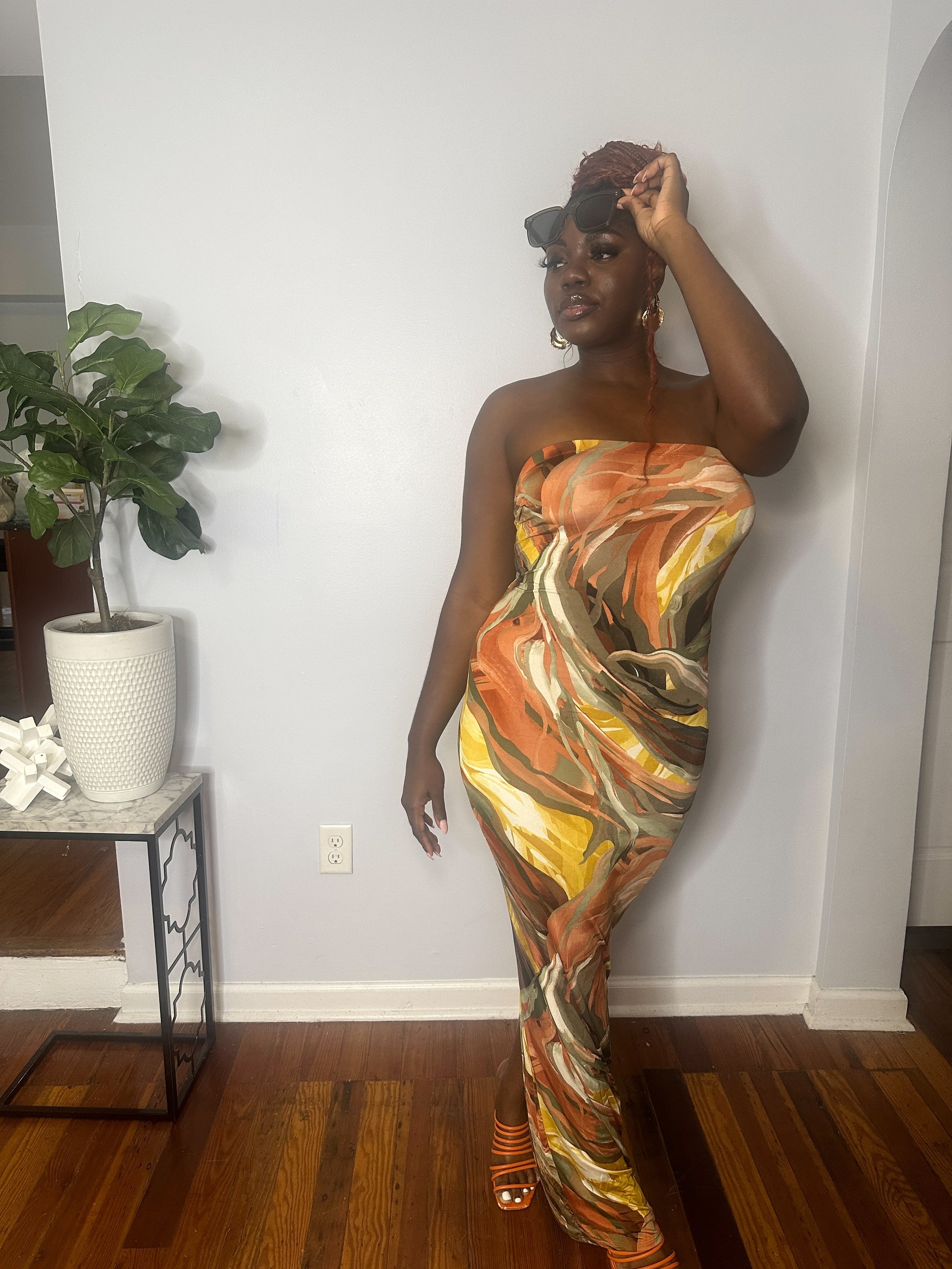 Halter maxi dress with mixed print throughout. Slit in the back. Great stretch and fits true to size. Model is wearing a medium.